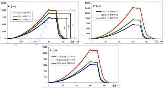 Examples of indentation graphs for C45, X20Cr13, and 34CrNiMo6 steels.
