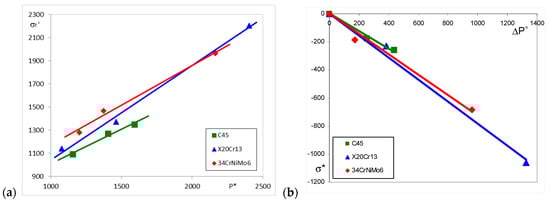 It can be seen that the particular values of the indentation force P* are different for each material and depend on the tempering temperature of the Q and T process. The relationships between the indentation force P* and the fatigue strength coefficient σf′ for particular steels and different tempering temperatures are depicted in Figure 10a.