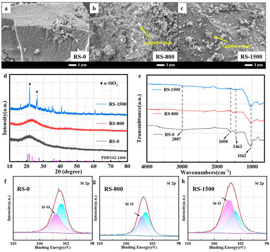 SEM for RS-0 (a), RS-800 (b), and RS-1500 (c); XRD of all samples (d); FTIR of all samples (e); XPS for RS-0 (f), RS-800 (g), and RS-1500 (h).