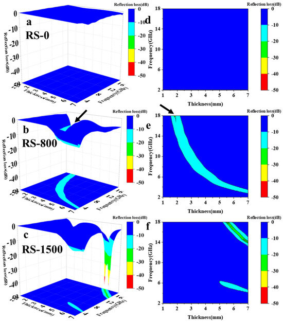 When RL reached −10 dB, it corresponded to EMA efficiency of 90%, and materials with RL values less than −10 dB fell into the range of EAB, meaning they absorbed electromagnetic waves efficiently [34]. Figure 2 illustrates the correlation between the RL values and changes in thickness and frequency for RS-0, RS-800, and RS-1500. The thicknesses under investigation spanned from 1 to 7 mm, and the frequencies tested ranged from 2 to 18 GHz. In Figure 2a, it was evident that RS-0 exhibited poor EMA performance, which might stem from its less favorable dielectric characteristics. However, when subjected to heat treatment, these samples demonstrated significantly better EMA performance at higher frequencies. Figure 2b,e demonstrates that RS-800 achieved an EAB of 6.01 GHz and an RLmin value of −22.54 dB. The arrows in the figures indicate the position of the RLmin value, indicating excellent EMA capability under the test conditions. Specifically, within the thickness range of 1.6 to 7 mm and the frequency range of 3 to 18 GHz, the material showed RL values consistently below −10 dB, indicating effective absorption over this spectrum. Turning to Figure 2c, it was observed that RS-1500 displayed an exceptional EMA property across a wide frequency band. Moreover, RS-1500 achieved a significantly broader EAB of 3.14 GHz and an RLmin value of −47.6 dB, reflecting its enhanced EMA capacity.