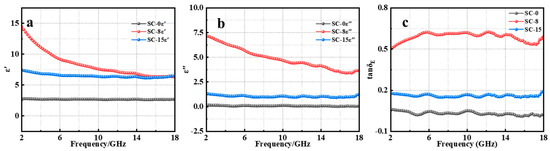 Electromagnetic parameters of all samples: real part of complex permittivity (a); imaginary part of complex permittivity (b); dielectric loss tangents (c).