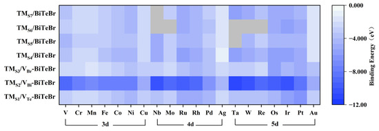 The stability of these SACs was initially assessed by calculating the single atom’s binding energy in which less than 0 eV is considered stable [43,44]. The binding energy values range from −11.26 to −1.21 eV, with the results summarized in Figure 2, indicating good stability for SACs. With an increase in the number of d orbital electrons in the dopant/adatom within the same period, the binding strength initially decreases, reaching a minimum at half-filled d orbitals. As the d electrons increase further, the binding strength stabilizes, and the elements with fully filled d orbitals demonstrate relatively weaker adsorption. This finding suggests that TM1 in stable half-filled and fully filled electronic states may exhibit less stable binding with the substrate [45]. Among these models, TMS2/VBi-BiTeBr shows a more stable trend, thanks to the hexacoordinated structure at its dopant sites. For SACs with a single-atom adatom on the Te-termination, TMS4/BiTeBr is slightly more stable than TMS6/BiTeBr; on the Br-termination, TMS5/BiTeBr and TMS7/BiTeBr have very similar energy levels. Furthermore, significant geometric distortion in some TMS6/BiTeBr SACs means their binding energies could not be obtained for inclusion in Figure 2.