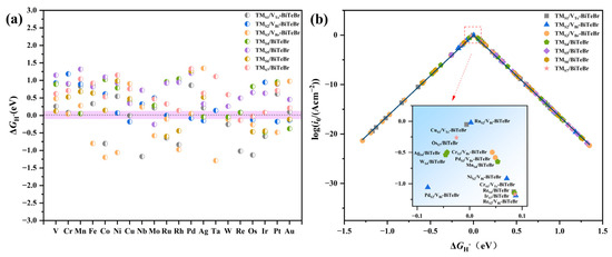 (a) The calculated adsorption free energy for different models. The pink area indicates |ΔGH*| < 0.10 eV. (b) The volcano curve of the exchange current i0 as a function of ΔGH* for the HER. The inset in (b) displays a local zoom-in around the peak of the volcano curve. In total, fourteen SACs were screened out as potential HER catalysts.