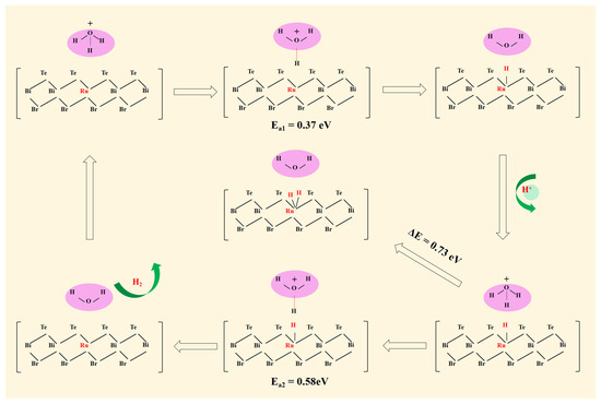 To investigate the proton transfer process during the HER and determine the corresponding mechanism for RuS2/VBi-BiTeBr, the explicit water molecule models were utilized. The explicit water molecule models have been successfully applied in the prior literature [48,49,50]. It is worth mentioning that in the explicit water molecule models with a few water molecules, variations in the configuration, orientation, and number of water molecules can have a significant impact on the system’s energy [51]. Thus, the several common explicit water molecule models of the system with H3O+ + (H2O)n for n = (0, 4, 5) were all constructed. Comparing the reaction energy between the CHE models and the corresponding explicit models (see Table 2), it was found that the reaction energy (−0.51 eV) of the system with H3O+ is close to the CHE model (−0.24 eV) [52]. For the other two explicit water molecule models, the reaction energy difference between their explicit models and the CHE model is relatively large. Consequently, the explicit model containing H3O+ was considered more suitable for this system and was chosen. The process of the HER on the RuS2/VBi-BiTeBr surface is illustrated in Figure 4. The H3O+ from the electrolyte first reacts with an electron, forming an adsorbed H at the Ru single-atom site. The activation energy for the Volmer reaction was calculated with a low barrier of 0.37 eV, indicating that this step is easily achievable. For the Tafel pathway, it subsequently requires the adsorption of another H atom at the Ru single-atom site. However, the adsorption energy is higher for 0.73 eV, indicating that the Tafel step is thermodynamically unfavorable. For the Heyrovsky pathway, H* reacts with a new pair of H3O+ + e− to produce H2. The activation barrier required for the Heyrovsky reaction has been calculated through a transition state search and it is 0.58 eV, which is easy to overcome. The results demonstrate that RuS2/VBi-BiTeBr is more conducive to the reaction through the Volmer–Heyrovsky mechanism.
