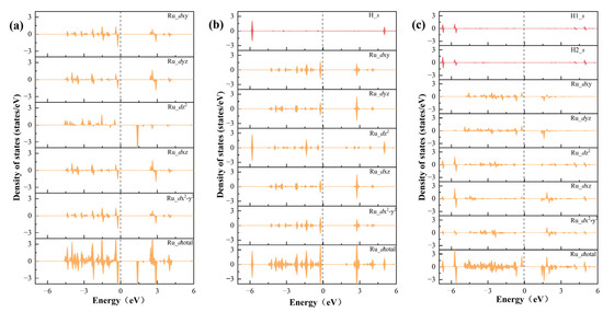 The PDOS of the d orbitals of Ru and the s orbitals of H in RuS2/VBi-BiTeBr (a), RuS2/VBi-BiTeBr*H (b), and RuS2/VBi-BiTeBr*2H (c).