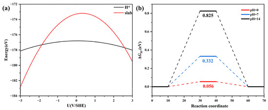 New challenges arise in exploring chemical reactions that involve the transfer of charge, such as the Volmer reaction and Heyrovsky reaction. In a real system, at the atomic scale, the interface area can be considered infinitely large, thereby keeping the electrode potential fixed in a single charge transfer reaction [53]. However, in the traditional CHE model, all the calculations were conducted under the condition of constant charge. The variations in potential occur during the charge transfer reactions due to the relatively small, simulated structure used in the calculation, which may have an impact on the calculation results. In this work, the double-reference method was employed to investigate the HER over the RuS2/VBi-BiTeBr surface under constant potential conditions [54]. By varying the electron quantity in the system, we simulated the electrochemical double layer as a function of potential in the implicit solvent. At the same time, the relationship between the catalytic activity and pH was elucidated. The calculated energies, plotted against the electrode potential (referenced to the Standard Hydrogen Electrode scale), are presented in Figure 6a, and the energy-potential points exhibit a good quadratic fit. The energy variation with potential is minimal for H* compared to the slab. This indicates that the energy of the slab has a significant response to the electric potential. The relationship between the catalytic activity and pH is illustrated in Figure 6b, the ΔGH* values increase with rising pH, and the ΔGH* at pH = 0 is determined to be 0.056 eV < 0.10 eV. The phonon dispersion was further calculated and is depicted in Figure S1, affirming the dynamic stability of RuS2/VBi-BiTeBr with no imaginary frequencies. Generally, Ru is less expensive than Pt. Simultaneously, single-atom catalysts enhance atom utilization, leading to cost savings compared to bulk Pt catalysts and reduced Ru consumption. The results suggest that RuS2/VBi-BiTeBr is a highly promising cathodic material, validating the rationality of the traditional CHE method for performance evaluation.