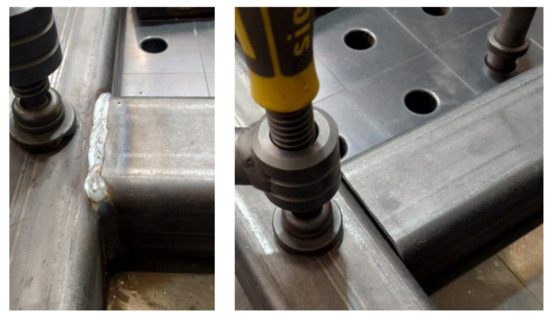 The objects of the study are the steel frames that form the basis of the test stand. The analyzed frames are formed in the joining process by welding closed sections of 120 × 80 × 8 made of material S235JRH/S275J0H (Figure 1). The welding method used is gas metal arc welding (GMAW) (MIG C340 Pro welder) argon and CO2 shielded welding in a ratio of 80–20%. Gas metal arc welding (GMAW), known by its variants metal inert gas (MIG) and metal active gas (MAG), is a welding technique in which an electric arc is generated between a consumable MIG wire electrode and the metal being worked on. This arc heats the metal, leading to their fusion (melting and joining). In addition to the wire electrode, a shielding gas is supplied through the welding gun to protect the process from atmospheric impurities. Before laying the main weld, the parts are initially joined with short welds. The welding parameters are as follows: 180–190 A, wire MC2K300MSPRE, diameter 1 mm, and weld laying speed about 10 mm/s.