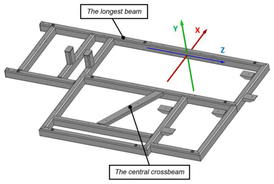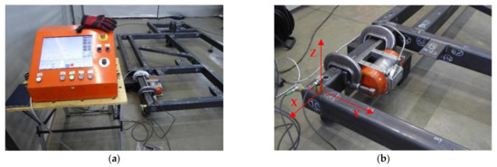Figure 1 shows the vibratory stress relief kit used in the study. It consisted of a control and monitoring unit from Wibropol and a WC2020 eccentric vibrator (WIBROPOL Marek Majewski, Promienko, Poland) mounted on the frame being relaxed. The location at which the vibrator is attached is crucial. It should ensure that the structure can be stimulated to vibrate with multiple modes. Thus, the vibrator should be attached preferably in places where the nodal points of individual vibration forms are not located. The adopted method of attaching the vibrator (its orientation) with respect to the frame made it possible to effectively excite the structure to vibration in the vertical Z and horizontal Y directions (Figure 2).