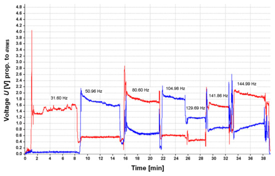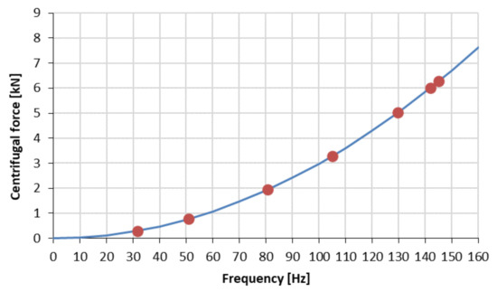Information on the RMS values of vibration accelerations from two accelerometers mounted vertically and horizontally on the frame was acquired from the control panel. The vibration transducers were mounted near the vibrator in the y–z plane, which was the plane of excitation of the frame to vibration. The diagram in Figure 3 shows the course of the sequential vibratory stress relief process. The course marked in red corresponds to vibration accelerations recorded in the vertical z-direction, and blue indicates vibrations in the y-direction. The values of the vertical axis of the graph express voltage [V] proportional to the RMS values of vibration accelerations recorded by accelerometers. On the horizontal axis, time is presented in seconds. Table 1 lists the parameters of sequentially conducted vibratory stress relief. Meanwhile, the dependence of the centrifugal force generated in the vibration stress relief process on the frequency of the eccentric vibrator shaft is provided in Figure 4.