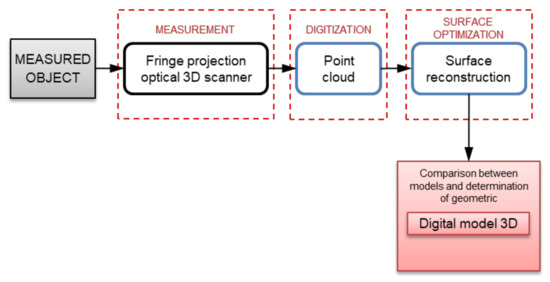 Three-dimensional scanning technology is increasingly used in industry to control the dimensions of objects with different spatial configurations. The wide application and development prospects of 3D scanning technology are presented in article [38]. Quality requirements for manufactured products have enforced the use of a method to analyze them in terms of shape and dimensions. Robotized measuring systems using optical scanners, in addition to a large number of measuring points and the lack of need for physical contact with the part being measured, also provide speed and repeatability of measurements [39]. This technology also has growing potential for measuring at smaller scales [40]. Thus, the use of 3D scanning technology is becoming an integral condition for ensuring that manufactured products have the required quality and for eliminating errors on every stage of the production process.