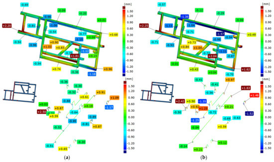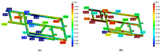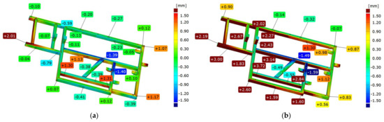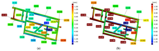 According to the geometric specifications, a second sample, called “frame 2”, was prepared. It was subjected to an analogous analysis as frame 1. In the first step, frame 2 was compared immediately after welding with the nominal model, the CAD model, according to two strategies: best-fit (Figure 12a) and 3-2-1 (Figure 12b).
