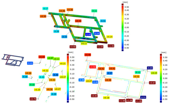 Figure 12 presents a colorful deviation map as an illustration of the comparison between the geometry of frame 2 right after welding and the corresponding CAD model. Based on the best-fit alignment, a colorful map of deviations is presented, from which it can be observed that—as in the case of frame 1—there are two crucial points on the front surface, where the deviations take the largest values. In contrast, there is concavity in the central part of the frame.