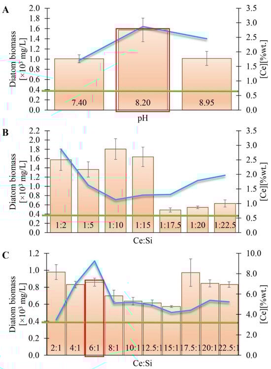 The amount of biomass obtained on the last day of the experiment depends on (A) the pH value and (B,C) the Ce:Si ratio of the content (%wt.) of cerium in diatom biomass (blue line). Key experiments for each series were marked with a red rectangle. Biomass accumulation of unmixed diatom cells (green line).