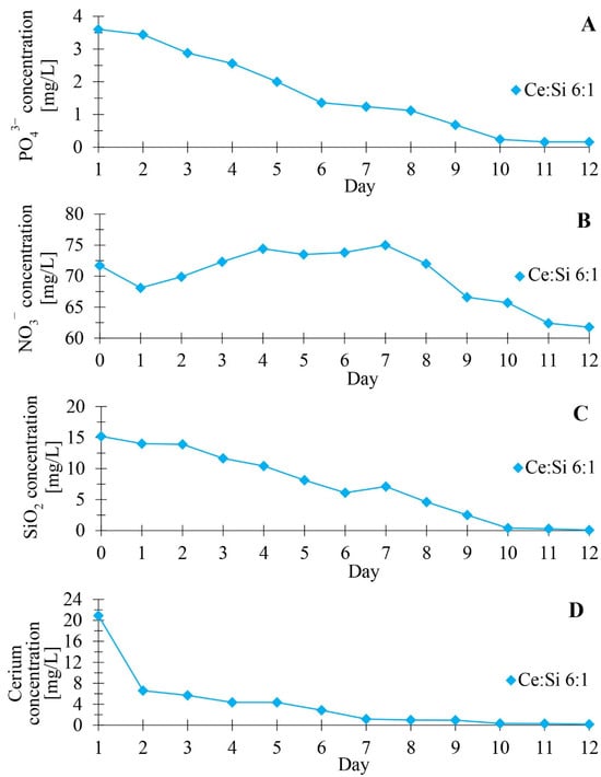 Figure 2 presents the changes in the concentration of phosphate, nitrate, silica, and cerium during a 12-day culture of diatoms doped with cerium ions with an initial concentration of 21 mg Ce/L. The content of the components mentioned above in the culture medium was examined using photometric assays and the ICP-MS technique. Analysis of the obtained data on the rate of nutrient uptake from the culture medium showed that an intensive uptake of phosphorus, nitrogen, silicon, and cerium occurs during the first few days of culture. These observations correlate with the data in the literature, emphasising that microalgae’s rapid growth phase is often observed early in their development [21,22]. During this period, nutrient availability is not a limitation to the intensification of microalgae biological processes. Over time, as the rate of cell division of microalgae decreases, their biomass accumulates, which continues until nutrients in the medium begin to limit the growth of diatom cells, leading to the stationary phase.