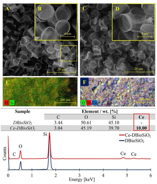 The results in Figure 3 indicate an overview of SEM microphotographs and EDX analysis results of pure biosilica derived from the diatom species Pseudostaurosira trainorii and biosilica doped with cerium ions. Comparing the morphology of cerium ion-modified frustules (Figure 3C,D) with undoped frustules (Figure 3A,B), it can be seen that despite the modification processes, the intricately decorated, three-dimensional structure of diatom frustules was preserved, along with its symmetry and regularity of structural elements [15,23]. This indicates the high structural stability of the diatom frustules. SEM-EDX analysis confirmed that pure diatom frustules are composed of oxygen and silicon, while frustules doped with cerium ions are composed of oxygen, silicon, and cerium.
