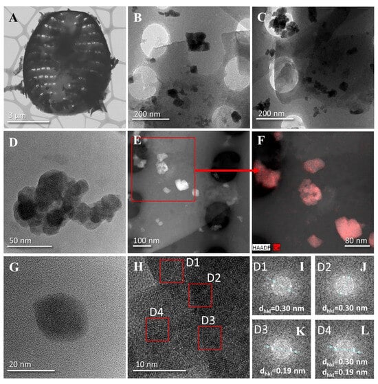 TEM images of the composite 10%Ce-DBioSiO2: (A)—a single frustule covered with cerium nanoparticle clusters, (B,C)—magnifications of selected fragments of the diatom frustules, (D)—magnification of the agglomerate/cluster of the created nanoparticles, (E)—STEM image of NPs distribution on the frustule, (F)—TEM-EDX mapping of cerium distribution, (G)—HR-TEM view of a single cerium nanoparticle, (H)—HR-TEM image of cerium nanoparticles, and (I–L)— selective area electron diffraction (SAED) of individual nanoparticles.