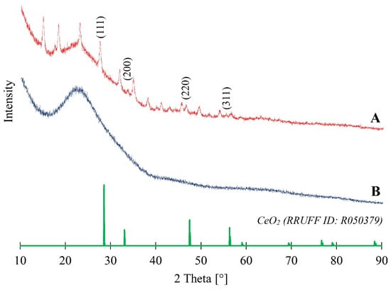XRD patterns of 10%Ce-DBioSiO2 composite (A) and pure diatom biosilica DBioSiO2 (B).