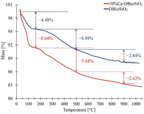 Figure 6 presents the results of thermogravimetric (TG) analysis for a sample of diatom biosilica (DBioSiO2) and a sample of cerium-doped material (10%Ce-DBioSiO2). TG analysis was conducted in a nitrogen atmosphere to assess these materials’ thermal stability and degradation mechanisms in the temperature range from 29 °C to 1050 °C. For both analysed samples, three stages of mass loss can be observed, occurring at the following temperature ranges: stage I—from 29 °C to 160 °C, stage II—from 160 °C to 500 °C, and stage III—from 500 °C to 900 °C. The first stage of mass loss in the samples involves their dehydration, i.e., the removal of physically bound water molecules from the surface of the samples.