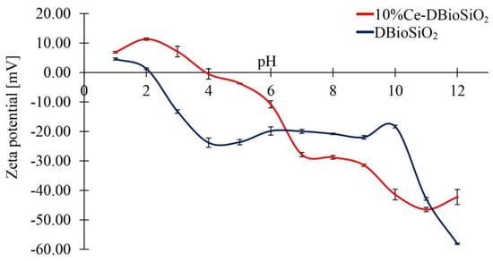 The electrokinetic stability of the material was evaluated by measuring the zeta potential (ζ-potential) in the pH range from one to twelve. Figure 7 shows the dependence of the zeta potential value on pH for pure biosilica and biosilica doped with cerium. In the pH range studied, the zeta potential value decreases with increasing pH for both samples (from +6.89 mV at pH = 1 to −58.11 mV at pH = 12). This decrease may be due to the progressive deprotonation of silanol groups (Si-OH ↔ SiO− + H+), which leads to an increase in the negative surface charge of the particles [47].