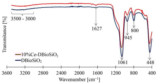Figure 8 presents FTIR spectra of biosilica doped with cerium ions (10%Ce-DBioSiO2) and undoped biosilica (DBioSiO2). Both spectra contain characteristic absorption bands at 448, 800, and 1061 cm−1 associated with valence and deformation vibrations of the Si-O-Si siloxane bonds present in the amorphous silica [51,52].