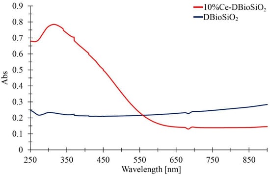 UV-Vis absorption spectra of DBioSiO2 and 10%Ce-DBioSiO2.