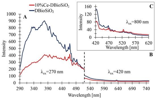 Photoluminescence spectra of samples DBioSiO2 and 10%Ce-DBioSiO2 presented in the three analysed ranges at excitation wavelengths of (A) 270 nm, (B) 420 nm, and (C) 800 nm.
