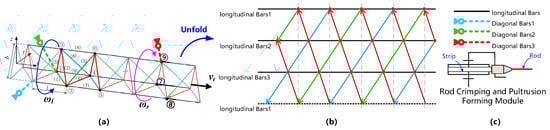 The manufacturing forms of truss structures are mainly classified into rod parts assembly, additive manufacturing, and winding forming. Considering the high efficiency, rapidity, and forming accuracy of truss manufacturing, this study investigates the crimping and pultruding forming process of basic material rods for truss structures via winding. As presented in Figure 1a, the triangular truss structure formed by winding consists of longitudinal and diagonal bars. The diagonal bars with the same color in the unfolding diagram in Figure 1b are arranged in the same vertical direction, indicating that each diagonal bar is continuous. The longitudinal bars should be continuous as well to satisfy the requirements of the truss length. Therefore, the truss rods are formed from continuous strips via the winding and pultruding forming process to create continuous rods with certain cross-sectional shapes, as shown in Figure 1c. The winding process of the diagonal rods utilizes rods that are not completely cooled and cured in the pultrusion forming process and thus have a certain flexibility; they are continuously wound around the longitudinal rods in accordance with the specific winding procedure. Then, the truss structure is formed through the connection of the nodes.