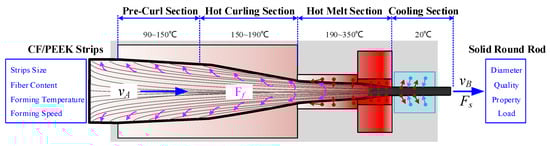 As shown in Figure 2, first, the CF/PEEK unidirectional prepreg tape enters the precurling section of the forming mold. The strip in a highly elastic state of viscoelasticity is used to achieve the precurl, and its stiffness is increased when it is pushed forward to avoid the frictional resistance caused by the inner wall of the cavity. This frictional resistance causes the wrinkles to form in the strip, which clog the mold. Second, the precurl of the strip enters the hot-curl section, in which the diameter of the hollow tube formed by the curling is gradually reduced, and the push force is maintained to realize gradual extrusion. After entering the hot-melt section, the base PEEK material enters in a viscous flow state at high temperature. The movement of the molecular chain of PEEK becomes increasingly intense and exhibits high mobility and plasticity under the actions of extrusion and high temperature. PEEK and carbon fiber filaments are produced in the structure of the hot-melt forming molds under the constraints of the formed solid cross section of the rod. Lastly, the cooling module converts PEEK from a viscous flow state to a glassy state, completes the cooling and shaping of the rod, and carries out the continuous conveying of the rod through the traction mechanism. The input parameters, such as strip size, fiber content, forming temperature, and speed, during the rod forming process affect the dimensional accuracy, surface quality, mechanical properties, and forming haul-off loads of the formed rods.