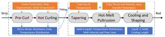 The forming process from strip to rod involves precurling, hot curling, tapering, hot-melt pultrusion, cooling, and shaping, as shown in Figure 3. Precurling and hot material’s curling realize the transition from a glassy strip to a highly elastic tubing, and the result of the process is used as an input for the next step. After tapering, hot-melt pultrusion, cooling, and shaping, the base PEEK material undergoes a highly elastic–viscous–fluidic–glassy transition to generate a solid rod.