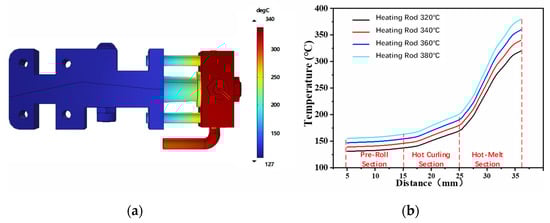 Forming mold temperature simulation results. (a) Under the temperature setting of 340 °C for the heating rod; (b) temperature gradient distribution of heating rods under different temperature conditions.