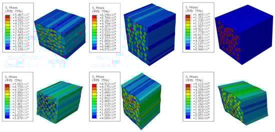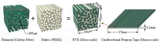 The CF/PEEK unidirectional prepreg tape consists of T700 carbon fiber and a PEEK matrix, as shown in Figure 5. The size of the RVE is 50 × 50 × 50 μm, and the volume fraction of the carbon fiber is 69%. Python script is used to generate the RVE model with a random distribution of carbon fiber. The material properties of the T700 carbon fiber and PEEK are given in Table 1, and the open-source Abaqus plug-in tool EasyPBC is employed to impose periodic boundary conditions. The material properties are analyzed and calculated under six different loading conditions, as shown in Figure 6, to obtain the macroscopic homogeneous effective elastic parameters of the unidirectional prepreg tape [16,17,18].
