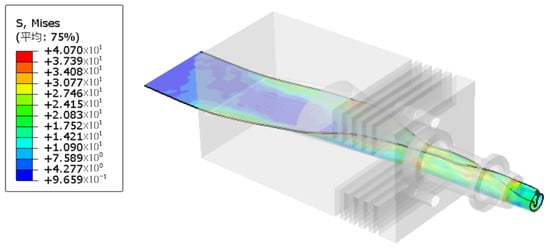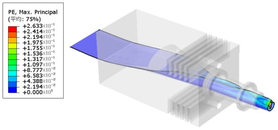 The calculated homogeneous effective elastic parameters are assigned to the elastic properties of the unidirectional prepreg strip on the basis of the material properties. The mold temperature load, strip continuation displacement, and linear velocity are applied by adding contact constraints between the strip and coiling mold cavity to obtain stress–strain maps of the strip-coiling process. The forming load pull and the shape of the tube’s coiling cross-section are adopted as input conditions for the next process.