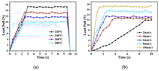 Simulation curve of forming load pull. (a) Under the condition of forming speed of 4 mm/s; (b) under the condition of forming temperature of 340 °C.