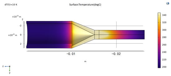 In accordance with the requirements of the temperature gradient of each interval segment in the principle of rod crimping and pultrusion forming, thermal simulation design of the tube structure size of the forming die was carried out to ensure the heat transfer balance from the heat source to the crimping die, and a heat insulation structure is added to the part of the crimping die that is solidly connected to the conduit to prevent excessive heat transfer. Figure 4a shows the temperature distribution under the condition that the temperature of the heating rod is 340 °C. The temperature of the curling mold is slightly higher than the glass transition temperature of PEEK at 143 °V, which softens the strip during the curling process and reduces the load generated by the curling deformation when the strip enters the mold. The temperature of the conduit is lower than the melting point of the PEEK to prevent the PEEK material from melting prematurely and producing wrinkles, which would result in mold clogging. Figure 4b shows the temperature profiles of the precurling, hot-curling, and hot-melt sections with the heating rod set to several temperatures. The profiles are used as the temperature boundary conditions in the subsequent curl-forming simulation process.