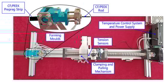 In accordance with the truss structure size setting, the cross-section of the rod is 2 mm in diameter, and according to the approximate equal cross-section calculation of the rectangular cross-section of the strip and the circular cross section of the rod, the strip is 0.2 mm thick and 17 mm wide. The inlet and outlet sizes of the forming mold of the test setup are designed based on this requirement. As shown in Figure 13, the test device consists of a forming die, pull transducer, clamping and pulling mechanism, temperature control system, and power supply to achieve real-time monitoring of the forming load pull in the process of rod crimping and pultruding. The carbon fiber type of the unidirectional CF/PEEK prepreg tape is T700, and the volume fraction of the fiber is 69%.