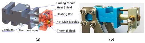 The temperature gradient distribution of a single heat source is achieved through the heat dissipation and insulation design of the forming mold to complete strip curling and rod pultrusion forming. The forming mold consists of a curling mold, conduit, heat-conducting block, thermal fusion mold, heating rod, heat-insulating piece, and thermocouple, as shown in Figure 14a. The heating rod heats up the heat-conducting block through contact heat transfer, thus achieving temperature uniformity in the hot-melt mold, reducing the inertia caused by temperature fluctuations, and improving the surface quality of the rod forming. As the connecting channel between the high- and low-temperature zones, the conduit can attain a balance between heat dissipation and heat conduction through the optimized design of its structure size to achieve temperature gradient distribution in the mold.