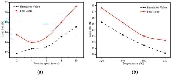 Comparison of simulated and measured values of formed load pulling force. (a) Under the condition of forming temperature of 340 °C; (b) under the condition of forming speed of 4 mm/s.