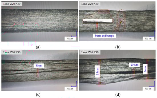 A comparative analysis of the surface of the rod formed under different heating temperatures and forming speed process parameters is performed. Figure 16a shows that the surface is smooth and without cracks or burrs at the forming speed of 4 mm/s and heating temperature of 340 °C. Figure 16b reveals that the surface is not smooth and has bumps and burrs when the forming speed is too low (i.e., 2 mm/s) and when the heating temperature is 340 °C. This condition leads to the melting of the adhesion of the substrate material, resulting in the uneven extrusion of the substrate material. Figure 16c,d show large cracks, but the reasons for their occurrence vary. Figure 16d reveals that when the forming speed is 10 mm/s (too high), heat transfer is reduced, the base material is not completely fused, and a crack is formed by elastic expansion after leaving the mold, which causes the diameter to increase.