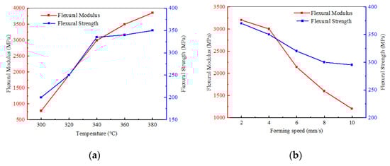 Rod bending performance trends. (a) Under the condition of forming speed of 4 mm/s; (b) under the condition of forming temperature of 340 °C.