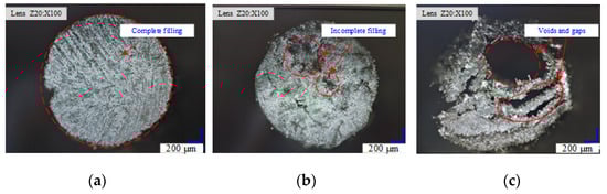 Rod section. (a) Under the conditions of forming temperature of 340 °C and forming speed of 4 mm/s; (b) under the conditions of forming temperature of 380 °C and forming speed of 4 mm/s; (c) under the conditions of forming temperature of 340 °C and forming speed of 10 mm/s.