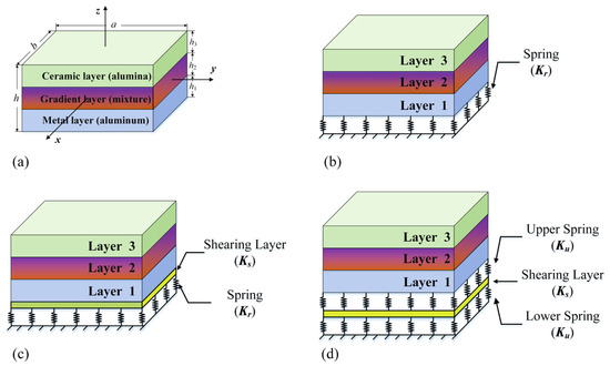 As shown in Figure 1a, a rectangular plate composed of a functionally gradient material is presented, with a length of a, width b, and thickness h. The top layer of the functionally graded sandwich rectangular plate is ceramic, the bottom layer is aluminum, and the sandwich layer is composed of mixed-gradient material. Taking a three-dimensional Cartesian coordinate system as the reference, the coordinate system is located at the geometric center of the rectangular plate, where x, y, and z are along the length, width, and thickness directions, respectively. Then, the arbitrary position of the rectangular plate can be expressed within a range between –h/2 and h/2 in the thickness direction. The bottom surface of the metal layer of the rectangular plate is continuously surrounded by an elastic foundation, which contains Winkler (Figure 1b), Pasternak (Figure 1c), and Kerr foundations (Figure 1d). For the Winkler foundation, the distributed load is uniform in both the horizontal and vertical directions, which is achieved using several linear springs with stiffness Kr uniformly distributed, and each spring represents a ground point. For the Pasternak foundation, considering the horizontal and shear stiffness of the foundation, it uses an elastic model, which contains Kr and Kg (a stiffness parameter on the shear layer) to simulate vertical and shear spring reactions. The Kerr foundation can be replaced by an elastic model with three parameters, where the outer surface is surrounded by lower springs of stiffness Kl, shear layer of stiffness Ks, and upper springs of stiffness Ku. By adding linear springs to describe the linear characteristics, the complex behavior of the foundation can be accurately simulated [22]. It is worth considering that, although the Kerr foundation has three parameters, the Kerr and Pasternak foundations have the same mathematical concepts. The three different foundations can be transformed into each other under certain condition while they have different physical meanings. By setting Kg = 0, the Pasternak foundation can be transformed into the Winkler model. Moreover, the Kerr foundation is a generalization of the Pasternak model [33].