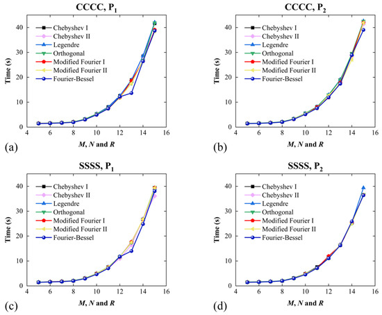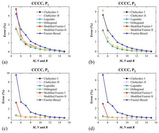 In general, the following aspects can be summarized: Firstly, although the boundary conditions are different, cases of the Fourier–Bessel polynomial have the largest number of terms when it reaches convergence; next are modified Fourier I and II. For the other cases (Chebyshev I and II, Legendre, and orthogonal polynomials), they show similar convergence characteristics, which have fast convergence properties. For M = N = R = 13, the errors of all are no more than 0.01%.