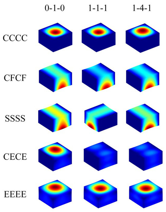 In this section, some other results of the free vibration of FGP sandwich rectangular plates resting on an elastic foundation are reported. Table 4 shows the fundamental frequency Ω of FGP sandwich rectangular plates with different porosity distributions, geometric parameters (h/b), thickness ratios, and boundary conditions resting on the Pasternak foundation. The parameters of the cases mentioned are as follows: a/b = 1; e0 = 0.2; kr = kg = 1012. Five types of boundary conditions are selected (CCCC; CFCF; SSSS; CECE; EEEE). The effect of porosity distributions and thickness ratios on the fundamental frequency of FGP sandwich rectangular plates is not significant. Under the same boundary condition, geometric parameter, porosity distribution, and thickness ratio, the case with a thickness ratio of 0-1-0 consistently corresponds to the largest fundamental frequency. Furthermore, the effects of porosity distributions are much more complex, and for different geometric parameters and boundary constraints, the highest fundamental frequency occurs at different porosity distributions. Like the case of a/b = 1, the largest fundamental frequency occurs with porosity distribution P3 under the CCCC boundary condition, while under the EEEE boundary condition, the largest value comes with P1. The increasing aspect ratios of FGP sandwich rectangular plates lead to an increase in the fundamental frequency, but it does not affect their variation patterns under different conditions. Figure 5 provides various mode shapes for FGP sandwich rectangular plates with porosity distribution P1 and different thickness ratios under different boundary constraints, while the mode shapes with porosity distribution P1 and different geometric parameters resting on the Pasternak foundation are shown in Figure 6.