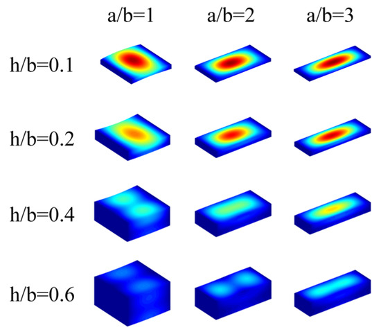 Several mode shapes for FGP sandwich rectangle plates resting on Pasternak foundations with different a/b and h/b.