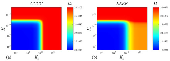 Figure 7 and Figure 8 illustrate the effects of parameters of the Pasternak foundation (Kr and Kg) and Kerr foundation (Ku, Ks and Kl) on the fundamental frequency Ω of functionally graded porous sandwich rectangular plates, where both the CCCC and EEEE boundary constraints are taken into consideration. The geometric parameters and material properties are as follows: a/b = 2; h/b = 0.4; e0 = 0.4; k = 1; porosity distribution: P1; thickness ratio: 1-1-1. Under the CCCC boundary condition resting on the Pasternak foundation (Figure 7a), when Kg is less than 2.5 × 109 and Kr is less than 4 × 1010, the Ω remains constant (minimum value). Meanwhile, when within a range of 2.5 × 109 < Kg < 4 × 1010 and Kr < 4 × 1011 (or Kg < 4 × 1010 and 4 × 1010 < Kg < 4 × 1011), the Ω rapidly aggrandizes. As Kg and Kr continue to increase, the tends to reach a constant maximum value. When it comes to the EEEE boundary condition (Figure 7b), the major trend of Ω is mostly consistent with that under the CCCC boundary constraint, while the difference is that when Kg is greater than 4 × 1011, the convergence region of the maximum value reached by Ω is smaller (compared to CCCC boundary constraints). Under the CCCC boundary condition (Figure 8a) and SSSS boundary condition (Figure 8b) resting on the Kerr foundation, the effects of Ku and Ks on FGP sandwich rectangular plates are more complex than that resting on Pasternak foundations. Similarly, there are three convergence regions (minimum, relative maximum, and maximum values) and one irregular transition region (within a range of 4 × 106 < Ku < 4 × 1011 and Ks > 1 × 1010) of in the contour plots for both boundary conditions resting on the Kerr foundation. The differences are that the effects of Ku and Ks in the Kerr foundation on are more sensitive in this transition region, which is affected by the syntactic effect of Ku and Ks.