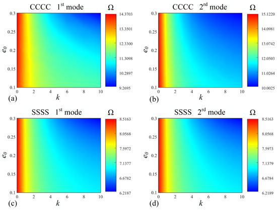 In order to investigate the effects of the porosity coefficient e0 and volume fraction index k on the vibration characteristics of FGP sandwich rectangular plates, Figure 9 shows the values of the first and second frequencies under different boundary conditions (CCCC and SSSS) resting on the Pasternak foundation as e0 and k vary. The relevant parameters are a/b = 2; h/b = 0.4; e0 = 0.4; k = 1; porosity distribution: P1; thickness ratio: 1-1-1. For accuracy, the parameters of the elastic foundation are taken as Kr = Kg = 1015. In addition, the values of 0.1 ≤ e0 ≤ 0.3 and 0 ≤ k ≤ 10 are selected in this study. Firstly, it can be clearly observed that the Ω remains constant when k = 0, which is due to the fact that the core of the rectangular plate is not a functionally graded material. Then, the Ω decreases as e0 and k increase, while it is less noticeable when e0 and k are small, as it does not reach the corresponding thresholds. Overall, for different boundary conditions, the trends of the effects of e0 and k are generally similar.