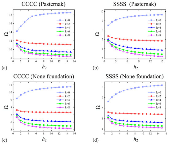 The variation in the fundamental frequency of FGP sandwich rectangular plates with core thickness h2 and volume fraction index k under the CCCC boundary condition and SSSS boundary condition resting on the non-elastic and Pasternak foundations can be observed in Figure 10. The parameters not studied are consistent with those in Figure 9, so the thickness ratio of the sandwich plate can be expressed as 1-h2-1. From Figure 10, it can be observed that when k = 0, indicating that the plate is not made of functionally graded material and the core layer is just a porous alumina layer, the Ω aggrandizes as h2 increases. When k > 0, the Ω decreases with the increase in h2 and k. The trends of the fundamental frequency of FGP sandwich rectangular plates with respect to h2 and k are generally consistent under different boundary conditions and resting on non-elastic or elastic foundations, which is not surprising.