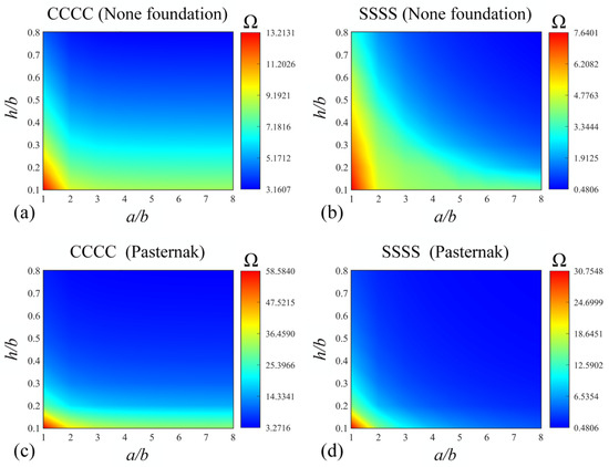Variations in with a/b and h/b for FGP sandwich rectangle plates resting on (a,b) non-elastic and (c,d) Pasternak foundations under different boundary conditions: (a,c) CCCC and (b,d) SSSS boundary conditions.