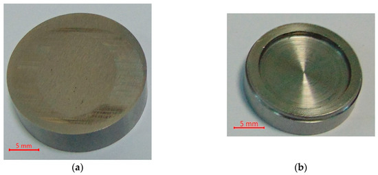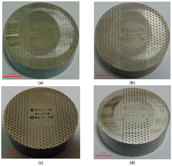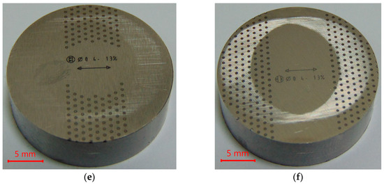 Three types of textured surfaces were tested. The dimples had circular shapes. The dimple depths were 25 ± 5 µm. These types were described by dimple diameter and pit area ratio. Type T04,13 of the textured surface was characterized by a dimple diameter of 0.4 mm and a pit area ratio of 13%, T02,13 by a dimple diameter of 0.2 mm and a pit area ratio of 13%, and T02,3 by a dimple diameter of 0.2 mm and a pit area ratio of 3%. Tunt refers to the untextured type. The sizes and distributions of oil pockets were selected due to their ability to catch wear products and to produce hydrodynamic lift by changing the pressure in the oil film. Figure 3 presents examples of textured disc types.