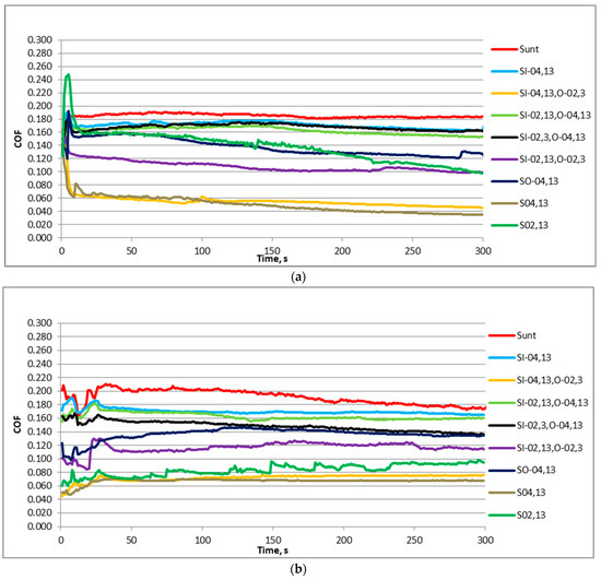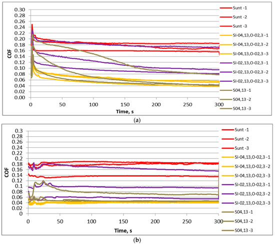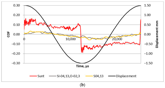 Different shapes of the friction coefficient emerged with a higher frequency of oscillation (Figure 9b). The coefficient of friction increased during the first 30–35 s, then it decreased, then increased, and then obtained stable value. However, after initial fluctuations, the further changes in the friction coefficient were low. It seems that the friction coefficients were more stable, compared to those derive during the work at a smaller normal load (Figure 5). A high variability in the friction coefficient for the assembly with sample S02,13 occurred.